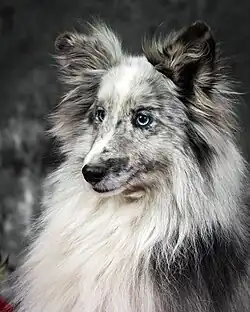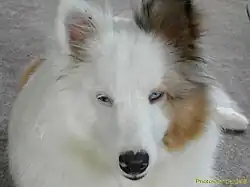 This mostly white Shetland has several conformational faults, such as pricked ears, too much white colouration (due to it being a double merle), microphthalmia, and pink spots in the nose. This dog would not be considered breeding stock.