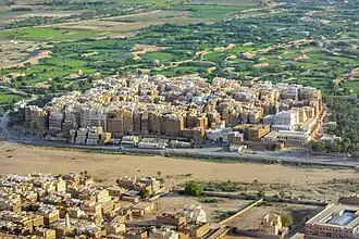 Shibam (Arabic: شِبَام, romanized: Shibām),[2][4] officially the Old Walled City of Shibam (Arabic: مدينة شبام القديمة وسورها), is a town in Wadi Hadhramaut in eastern Yemen with about 7,000 inhabitants. It is the seat of the Shibam District in the Hadhramaut Governorate.[1] It is known for its mudbrick-made high-rise buildings, with some of the buildings reaching as high as 11 stories. The design centred around protecting the residents of the city from Bedouin attacks.