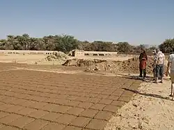 The first known inscription about the city dates from the 3rd century CE.[6][7] According to al-Hamdani, the origins of the city of Shibam date back to the pre-Islamic period, when the town rose to prominence until it became the capital of the Kingdom of Hadhramaut in 300 AD, after the destruction of its previous capital, Shabwa, located in the far west of the Hadhramaut Valley.[8][7] It is not clear whether the current city is standing where the ancient city stood, a theory suggests that the city's rise of more than 6 meters from the surrounding floor plain might be because of the accumilation of ruins over a long period of time, although there hasn't been any archaeological excavations that back this theory up and it might be a natural outcrop of the mountain spur behind it.[7]