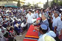 In February 1977, Peres challenged Prime Minister Rabin for the leadership of Labor Party, but lost to Rabin in a narrow 50.72% to 49.28% result in the vote by the party's Central Committee.[61][29][62][63] The leadership election was expected to determine who would lead the party into the 1977 Knesset election. This was at moment when Labor was threatened with the prospect of losing its control of government after 28-consecutive years due to the rise of both the right-wing Likud bloc and the centrist Democratic Movement for Change, which were seen as collectively cutting into the Labor Party's support in the upcoming election. At the time, Rabin and Peres presented little policy difference, with Peres being seen as only slightly to the right of Rabin on domestic matters. Instead of positioning himself in contrast to the incumbent Rabin on policy, Peres instead capitalized off of the political atmosphere and staked his candidacy largely on an argument that the Labor Party needed to satisfy the nation's desire for change by choosing a new leader for itself.[62]