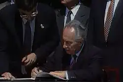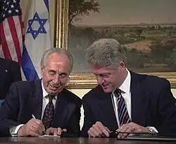 Peres first succeeded Yitzhak Rabin as acting prime minister briefly during 1977, before becoming prime minister from 1984 to 1986. As foreign minister under Prime Minister Rabin, Peres engineered the 1994 Israel–Jordan peace treaty,[12] and won the 1994 Nobel Peace Prize together with Rabin and Yasser Arafat for the Oslo Accords peace talks with the Palestinian leadership.[7] In 1996, he founded the Peres Center for Peace, which has the aim of "promot[ing] lasting peace and advancement in the Middle East by fostering tolerance, economic and technological development, cooperation and well-being."[13] After suffering a stroke, Peres died in 2016 near Tel Aviv.[14][15]