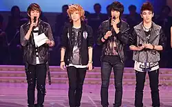 Shinee released an original Japanese single, "Dazzling Girl", on October 10, 2012.[80] The single sold 97,111 copies in its first week[80] and was chosen to be the theme song for the Japanese TV series Sukkiri.[81] On November 19, 2012, along with actor Kim Soo-hyun, Shinee won the Ministry of Culture Award at South Korea's Ministry of Culture, Sports and Tourism and Korea Creative Content Agency's (KOCCA) annual award show, the Korean Popular Culture and Arts Awards, at Seoul Olympic Hall.[82][83] Shinee attended the 2012 Mnet Asian Music Awards in November 2012, which was held in Hong Kong, winning Best Dance Performance – Male Group for their latest Korean single, "Sherlock (Clue + Note)".[84][85][86] Shinee released their first Japanese ballad single (sixth overall), "1000-nen, Zutto Soba ni Ite...", and the concert video album for their Shinee World 2012 arena tour on December 12, 2012.[87]