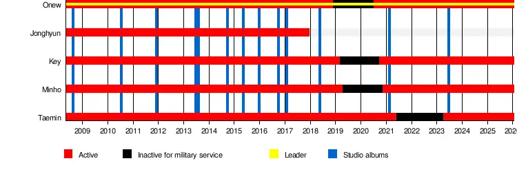 Onew applied and enlisted for his mandatory military service in December 2018.[159] It was announced in early 2019 that both Key and Minho would be enlisting in the first half of the year.[160] Key applied for military band service and enlisted on March 4, 2019.[161] Minho enlisted in the Marines on April 15, 2019.[162]