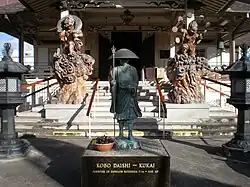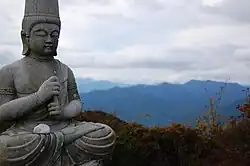 Kūkai was born to a family of the aristocratic Saeki clan in Shikoku and received a classical Confucian education at Kyoto's college (daigaku).[8][9] He converted to Buddhism in his 20s and was inspired to practice asceticism in the mountains and wander the countryside as an ascetic hermit (though he also visited cities to study texts).[10] During this time his main meditation was the mantra of bodhisattva Ākāśagarbha found in the Ākāśagarbha Memory-Retention Practice (虛空藏求聞持法, Kokūzō-gumonji-hō; Taishō no.1145). While he was practicing in the mountains, he had a vision of the bodhisattva flying at him.[11]