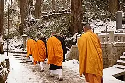 Also during this period, many followers of the Ji sect founded by Ippen (1234–1289) made Kōya-san their home, joining with the Kōya hiriji groups, and many halls for Amida centered Pure Land practice were built on the mountain.[35]