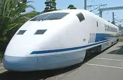 In English, Shinkansen trains are commonly referred to as the 'bullet train'. This expression is a literal translation of the Japanese nickname dangan ressha (弾丸列車), which dates to 1939 and was originally applied to early high-speed rail proposals during the initial planning stages of the project.[15] The name later became firmly associated with Shinkansen services due to their high operating speeds and the distinctive, bullet-like profile of the original 0 Series Shinkansen trains.