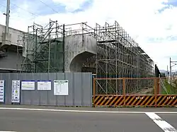 A combination of ballasted and slab track is used, with slab track exclusively employed on concrete bed sections such as viaducts and tunnels. Slab track is significantly more cost-effective in tunnel sections, since the lower track height reduces the cross-sectional area of the tunnel, reducing construction costs up to 30%.[34] However, the smaller diameter of Shinkansen tunnels, compared to some other high-speed lines, has resulted in the issue of tunnel boom becoming a concern for residents living close to tunnel portals.
