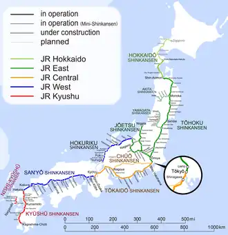 Starting with the Tokaido Shinkansen (515.4 km; 320.3 mi) in 1964,[3] the network has expanded to consist of 2,951.3 km (1,833.9 mi) of lines with maximum speeds of 260–320 km/h (160–200 mph), 283.5 km (176.2 mi) of mini-Shinkansen lines with a maximum speed of 130 km/h (80 mph), and 10.3 km (6.4 mi) of spur lines with Shinkansen services.[4] The network links most major cities on the islands of Honshu and Kyushu, and connects to Hakodate on the northern island of Hokkaido. An extension to Sapporo is under construction and was initially scheduled to open by fiscal year 2030,[5] but in December 2024, it was delayed until the end of FY2038.[6][7] The maximum operating speed is 320 km/h (200 mph) (on a 387.5 km (241 mi) section of the Tōhoku Shinkansen).[8] Test runs have reached 443 km/h (275 mph) for conventional rail in 1996, and up to a world record 603 km/h (375 mph) for SCMaglev trains in April 2015.[9]