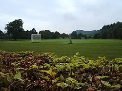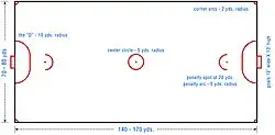 The objective of the game is to play a small ball into a goal, or "hail", erected at the ends of a 140-to-170-yard-long (128 to 155 m) by 70-to-80-yard-wide (64 to 73 m) pitch.[18] The game is traditionally played on grass, although as of 2009 the sport may be played on artificial turf.[19] The pitch also has marks indicating a 10-yard (10 m) area around the goals, the penalty and centre spots (along with their associated arcs/circles of 5 yards or 5 metres radius), and corner arcs at the corners of the rectangular pitch of 2 yards or 2 metres radius.[18] The goals, at opposite ends of the field, measure 12 feet (3.66 m) wide and 10 feet (3.05 m) high and a net is affixed to catch the ball when a goal is scored.[18]