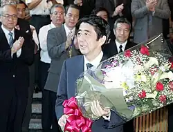 On 20 September 2006, Abe was elected to succeed Koizumi as the president of the ruling Liberal Democratic Party.[25] His chief competitors for the position were Sadakazu Tanigaki and Tarō Asō. Yasuo Fukuda was a leading early contender but ultimately chose not to run. Former prime minister Yoshirō Mori, to whose faction both Abe and Fukuda belonged, stated that the faction strongly leant toward Abe.[26]