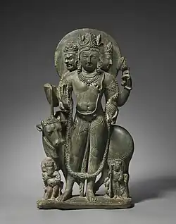 In the Śatarudrīya, some epithets of Rudra, such as Sasipañjara ("Of golden red hue as of flame") and Tivaṣīmati ("Flaming bright"), suggest a fusing of the two deities.[note 5] Agni is said to be a bull,[113] and Shiva possesses a bull as his vehicle, Nandi. The horns of Agni, who is sometimes characterised as a bull, are mentioned.[114][115] In medieval sculpture, both Agni and the form of Shiva known as Bhairava have flaming hair as a special feature.[116]
