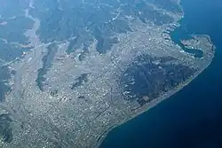 The fan-like shape of the Shizuoka Plain and Miho Peninsula were formed over the ages by the fast-flowing Abe River, carrying along collapsed sand and earth. These areas form the foundations of the city today.[7]: 242  The isolated Mount Kunō separates the Suruga coastline from the Shimizu coastline.