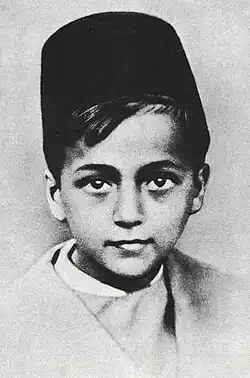 Born in Acre in the Acre Sanjak of the Ottoman Empire in 1896 or 1897, Shoghi Effendi was related to the Báb through his father, Mírzá Hádí Shírází, and to Baháʼu'lláh through his mother, Ḍíyáʼíyyih Khánum, the eldest daughter of ʻAbdu'l-Bahá.[11] ʻAbdu'l-Bahá, who provided much of his initial training, greatly influenced Shoghi Effendi from the early years of his life. Shoghi Effendi learned prayers from his grandfather, who encouraged him to chant. ʻAbdu'l-Bahá also insisted that people address the child as "Shoghi Effendi" rather than simply as "Shoghi" as a mark of respect towards him.[12]