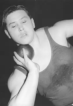 This is also known as the rotational technique.[8] It was first practiced in Europe in the 1950s but did not receive much attention until the 1970s.[9] In 1972, Aleksandr Baryshnikov set his first USSR record using a new putting style, the spin ("круговой мах" in Russian), invented by his coach Viktor Alexeyev.[10][11] The spin involves rotating like a discus thrower and using rotational momentum for power. In 1976 Baryshnikov went on to set a world record of 22.00 m (72.18 ft) with his spin style, and was the first shot putter to cross the 22-meter mark.[12]