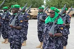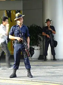 A Gurkha Contingent trooper in Singapore armed with a folding stock pump shotgun