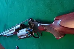 Taurus manufactures a carbine variant of the Taurus Judge revolver along with its Australian partner company Rossi, known as the Taurus/Rossi Circuit Judge. It comes in the original combination chambering of .410 bore and .45 Long Colt, as well as the .44 Remington Magnum chambering. The rifle has small blast shields attached to the cylinder to protect the shooter from hot gases escaping between the cylinder and barrel.[15]
