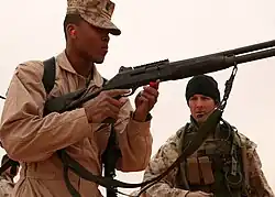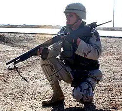 Since the end of World War II, the shotgun has remained a specialty weapon for modern armies. It has been deployed for specialized tasks where its strengths were put to particularly good use. It was used to defend machine gun emplacements during the Korean War, American and French jungle patrols used shotguns during the Vietnam War, and shotguns saw extensive use as door breaching and close-quarter weapons in the early stages of the Iraq War, and saw limited use in tank crews.[8] Many modern navies make extensive use of shotguns by personnel engaged in boarding hostile ships, as any shots fired will almost certainly be over a short range. Nonetheless, shotguns are far less common in military use than rifles, carbines, submachine guns, or pistols.