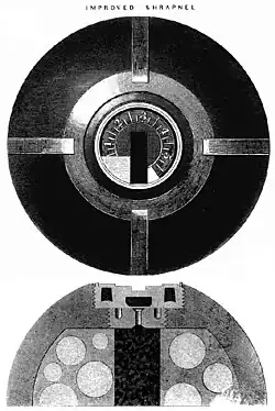 The design was improved by Captain E. M. Boxer of the Royal Arsenal around 1852 and crossed over when cylindrical shells for rifled guns were introduced. Lieutenant-Colonel Boxer adapted his design in 1864[4] to produce shrapnel shells for the new rifled muzzle-loader (RML) guns: the walls were of thick cast iron, but the gunpowder charge was now in the shell base with a tube running through the centre of the shell to convey the ignition flash from the time fuse in the nose to the gunpowder charge in the base. The powder charge both shattered the cast iron shell wall and liberated the bullets.[5] The broken shell wall continued mainly forward but had little destructive effect. The system had major limitations: the thickness of the iron shell walls limited the available carrying capacity for bullets but provided little destructive capability, and the tube through the centre similarly reduced available space for bullets.[6]