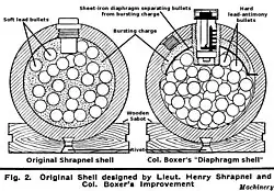 - ^ a b "The action of Boxer-shrapnel is well known. The fuse fires the primer, which conveys the flash down the pipe to the bursting charge, the explosion of which breaks up the shell, and liberates the balls". Treatise on Ammunition 1887, p. 216.