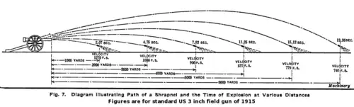 The other factor was the trajectory. The shrapnel bullets were typically lethal for about 300 yards (270 m) from normal field guns after bursting and over 400 yards (370 m) from heavy field guns. To make maximum use of these distances a flat-trajectory and hence high-velocity gun was required. The pattern in Europe was that the armies with higher-velocity guns tended to use heavier bullets because they could afford to have fewer bullets per shell.[10]