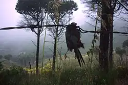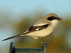 Male shrikes are known for their habit of catching insects and small vertebrates and impaling them on thorns, branches, the spikes on barbed-wire fences, or any available sharp point. These stores serve as a cache so that the shrike can return to the uneaten portions at a later time.[8] The primary function of conspicuously impaling prey on thorny vegetation is however thought to be for males to display their fitness and the quality of the territory held to prospective mates.[9] The impaling behaviour increases during the onset of the breeding season.[10] Female shrikes have been known to impale prey, but primarily to assist in dismembering prey.[11] This behaviour may also serve secondarily as an adaptation to eating the toxic lubber grasshopper, Romalea microptera. The bird waits 1–2 days for the toxins within the grasshopper to degrade before eating it.[12]