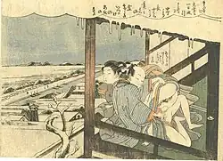 The Kyōhō Reforms, a 1722 edict, were much more strict, banning the production of all new books unless the city commissioner gave permission. After this edict, shunga went underground. However, since for several decades following this edict, publishing guilds saw fit to send their members repeated reminders not to sell erotica, it seems probable that production and sales continued to flourish.[3] Further attempts to prevent the production of shunga were made with the Kansei Reforms under Emperor Kōkaku in the 1790s.[4]