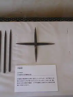 Some derived their names from the materials of which they were made, such as kugi-gata (nail form), hari-gata (needle form) and tantō-gata (knife form); some were named after an object of similar appearance, such as hoko-gata (spear form), matsuba-gata (pine-needle form); while others have names that are purely descriptive, such as kankyuto (piercing tool form), kunai-gata (utility tool form), or teppan (plate metal) and biao (pin).[3]