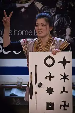 A shuriken (Japanese: 手裏剣; lit. 'hand-hidden blade') is a Japanese concealed weapon used by samurai or ninja or in martial arts as a hidden dagger or metsubushi to distract or misdirect.[1][2]
