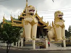 A pair of leogryphs guarding the entrance to the walkway leading up Singuttara Hill to Shwedagon Pagoda