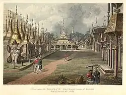 View of the Great Dagon Pagoda in 1825, from a print after Lieutenant Joseph Moore of Her Majesty's 89th Regiment, published in a portfolio of 18 views in 1825–1826 lithography