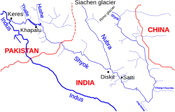 The glacier's melting waters are the main source of the Nubra River in the Indian region of Ladakh, which drains into the Shyok River. The Shyok in turn joins the 3000 kilometre-long Indus River which flows through Pakistan. Thus, the glacier is a major source of the Indus[52] and feeds the largest irrigation system in the world.[53]