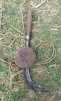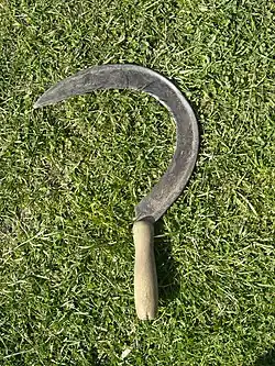 Called Hasiya (or Aasi), a sickle is very common in Nepal as the most important tool for cutting used in the kitchen and in the fields.[9] Hasiya is used in the kitchen in many villages of Nepal where its used to cut vegetables during food prep. The handle of Hasiya (made of wood) is held pressed by the toe of one's foot and the curve inverted so vegetables can be cut with two hands while rocking the vegetable. Outside of home, Hasiya is used for harvesting.