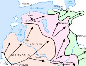 Map of Army Group North's advance into the USSR in 1941. Coral up to 9 July, pink up to 1 September and green up to 5 December.