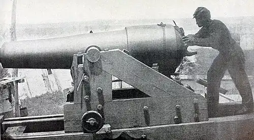 Ellet's men returned to De Soto Point and constructed an artillery battery targeting an iron foundry recasting spent Union artillery shells. Construction was begun on June 19, which placed a 20-pounder Parrott rifle in a casemate of railroad iron. The targeted foundry was destroyed on June 25 and the next day a second Parrott gun was added to the battery, which continued to harass the defenders until the garrison's surrender.[38]