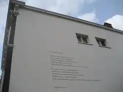 On 11 November 1985, Sassoon was among 16 Great War poets commemorated on a slate stone unveiled in Westminster Abbey's Poet's Corner.[49] The inscription on the stone was taken from Wilfred Owen's "Preface" to his poems and reads: "My subject is War, and the pity of War. The Poetry is in the pity."[50]