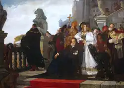In accordance with the new Treaty of Kraków, the Order was abruptly secularized and turned de facto into a puppet state of Poland which lasted until the Treaty of Bromberg in 1655. Sigismund's nephew Albert, Duke of Prussia, converted to Lutheranism under the persuasion of Martin Luther, and paid a feudal homage to Sigismund.[27] In return he was granted the domains of the Order as the First Duke of Prussia. This became known in Polish and Lithuanian history as the "Prussian Homage", which was often featured in arts. The Prussian Landtag and parliament assembled in Königsberg, where envoys embraced both the new Duke and the Protestant Reformation. Thereupon, the Teutonic Order lost its importance as a military order in Prussia and retreated to the Holy Roman Empire where it became secluded.[26]