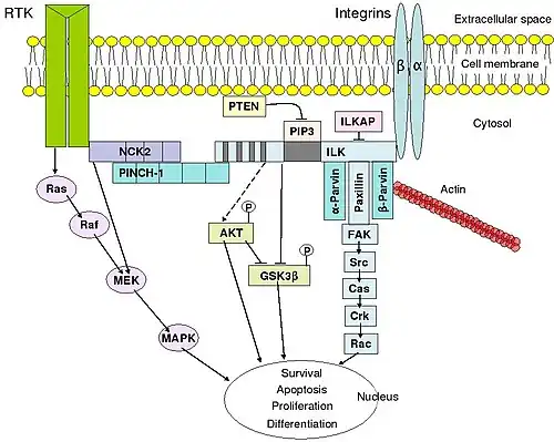 Integrins are produced by a wide variety of cells; they play a role in cell attachment to other cells and the extracellular matrix and in the transduction of signals from extracellular matrix components such as fibronectin and collagen. Ligand binding to the extracellular domain of integrins changes the protein's conformation, clustering it at the cell membrane to initiate signal transduction. Integrins lack kinase activity; hence, integrin-mediated signal transduction is achieved through a variety of intracellular protein kinases and adaptor molecules, the main coordinator being integrin-linked kinase.[40] As shown in the adjacent picture, cooperative integrin-RTK signaling determines the timing of cellular survival, apoptosis, proliferation, and differentiation.