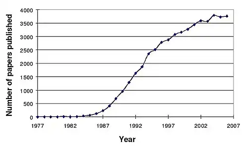 In 1970, Martin Rodbell examined the effects of glucagon on a rat's liver cell membrane receptor. He noted that guanosine triphosphate disassociated glucagon from this receptor and stimulated the G-protein, which strongly influenced the cell's metabolism. Thus, he deduced that the G-protein is a transducer that accepts glucagon molecules and affects the cell.[67] For this, he shared the 1994 Nobel Prize in Physiology or Medicine with Alfred G. Gilman. Thus, the characterization of RTKs and GPCRs led to the formulation of the concept of "signal transduction", a word first used in 1972.[68] Some early articles used the terms signal transmission and sensory transduction.[69][70] In 2007, a total of 48,377 scientific papers—including 11,211 review papers—were published on the subject. The term first appeared in a paper's title in 1979.[71][72] Widespread use of the term has been traced to a 1980 review article by Rodbell:[67][73] Research papers focusing on signal transduction first appeared in large numbers in the late 1980s and early 1990s.[50]