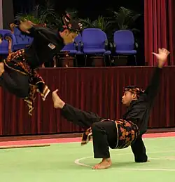 Other theories derive silat from the Sanskrit śīla meaning morality or principle, or the Southern Chinese saula (手拉) which means to push or perform with the hands.[8] The Sanskrit theory is particularly popular in Thailand, as sila is an alternate form of the word silat in that country. Other similar-sounding words have been proposed, but are generally not considered by etymologists. One example is si elat which means someone who confuses, deceives or bluffs. A similar term, ilat, means an accident, misfortune or a calamity.[9] Yet another similar-sounding word is silap meaning wrong or error. Some styles contain a set of techniques called Silap Langkah designed to lead the opponent into making a mistake. It’s not very easy[8]