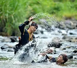 Folklore commonly credits the promulgation of silat to pendeta or Hindu-Buddhist sages, often through the study of animals and the natural world. The priests were said to combine the animal movements with meditative postures (semadi) and mystic hand positions (mudra), much like the kuji-in of ninjutsu. The animal-based concept was most likely adopted from Indian martial arts.[17] The village shamans or dukun would often learn silat both as part of their craft and for defending themselves while travelling. Bomoh in some communities such as the Kadayan are required to complete their training in silat before they are initiated. Silat is still an integral aspect of healing rituals such as main puteri. Through this connection, silat is used as a method of spiritual training in addition to self-defense.[8] Systems exist which focus exclusively on the internal rather than the physical, such as the Joduk style of Bali.[18]