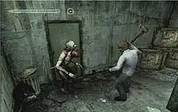 In the main levels of the game the player uses the usual third-person view of the Silent Hill series.[2] The player has a limited item inventory which can be managed by leaving unneeded items in a chest in Henry's room.[3] Silent Hill 4 emphasizes combat during gameplay, with a near-absence of complex puzzles in favor of simple item-seeking tasks.[2] Unlike previous games in the series, separate difficulty settings for combat and puzzles are not available; changing the combat difficulty also affects the difficulty of puzzles.[5] In the second half of the game Henry is accompanied and helped in combat by his neighbor Eileen Galvin. Eileen cannot die while she is with Henry, although as she takes damage she succumbs to possession,[6] which also occurs if she is given a firearm. The damage Eileen takes in the game determines whether or not she dies during the final boss fight, directly affecting the ending achieved.[4][7]