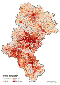 Silesian voivodeship is the most densely populated and most urbanized region of Poland. More than three-fourths of residents live in urban areas, compared to less than 60% on average in Poland.[10] Population density is nearly three times the average, with more than 350 people per square kilometer (nearly 1,000 per square mile).[11] Population density is particularly high in the central part of the region where the polycentric Katowice urban area is located.