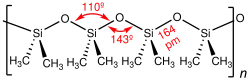 All polymerized siloxanes or polysiloxanes, silicones consist of an inorganic silicon–oxygen backbone chain (···−Si−O−Si−O−Si−O−···) with two groups attached to each silicon center. The Si center is tetrahedral. The O atoms adopt a bent ether-like geometry. The R2Si centers are well separated from each other, which means that the chain is particularly flexible.[6]