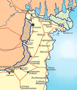 After the Roman province of Moesia was founded in 12 AD, the Romans built a fort in 29 on the site of an earlier Thracian settlement and kept its name, Durostorum (or Dorostorum). During the reigns of Claudius (41-54 AD) and Nero (54-68), the eastern border of Moesia was extended to the mouth of the river Iatrus (the modern Yantra).[8] Durostorum was one of several important river points along the Moesian Limes frontier. After Trajan's Dacian Wars the fort was enlarged into a legionary fortress for the Legio XI Claudia who stayed there from before 114 until c. 400.[9] It became an important military centre of the Roman province of Moesia, and grew into a city at the time of Marcus Aurelius. The city was strongly affected by an invasion of the Costoboci in 170.