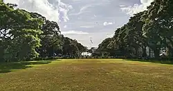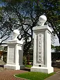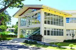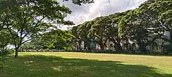 Silliman is located in Dumaguete, a quiet and peaceful seaside community with a population of 142,171.[53][54][55] The university campus has a total land area of 62 hectares composed of the main campus along Hibbard Avenue, and the campus for the College of Agriculture and the Institute of Environmental and Marine Sciences to the north. Dotted by large acacia trees, the main campus is home to most of the colleges and schools of the university and is adjacent to the city's downtown district. Occupying almost one-third of the downtown area, the campus faces the sea to the east, flanked by its portals which are now considered symbols of the school and city. The three most prominent portals are the Gates of Knowledge, Opportunity and Service. The Gate of Knowledge is the current and main entrance; it is the starting point of the two-kilometer-long Hibbard Avenue which was named after Dr. David Sutherland Hibbard, one of the founders of the institution. The other prominent landmarks on the main campus are the Silliman Hall, which now houses the Heritage Museum; the Silliman University Church; the Robert B. and Metta J. Silliman Library; and the Claire Isabel McGill Luce Auditorium, the largest theater outside Metro Manila.[56] It is frequented by tourists so the university maintains a campus cruiser, a 15-seater golf cart or tram-like vehicle, to ferry visitors around the campus. It is used to transport students during regular days.[57]
