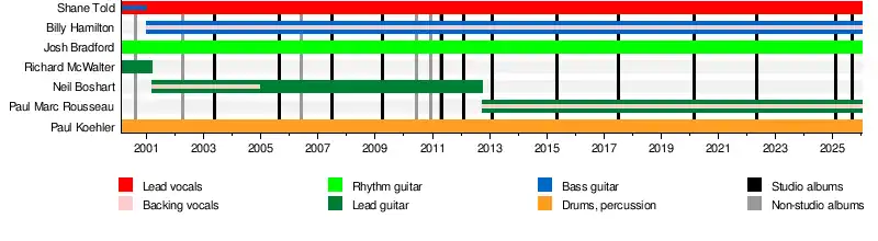 Silverstein's lineup remained unchanged from May 2001 to July 2012, then consisting of lead vocalist Shane Told, lead guitarist Neil Boshart, rhythm guitarist Josh Bradford, bassist Billy Hamilton, and drummer Paul Koehler. In September 2012, the band had announced that Neil Boshart had been fired and replaced by Paul Marc Rousseau, who also joined Billy Hamilton on backing vocals.