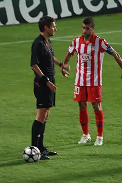 On 12 April 2009, Simão entered in the hundred-year history of the capital club by scoring its 4,000th goal in the league with a left-footed diagonal shot against Deportivo.[27] In the ensuing summer he became one of Atlético's captains for the new campaign, receiving that role from coach Abel Resino after a reshuffle;[28] as the Colchoneros underachieved overall, he scored in the Champions League at APOEL FC in a 1–1 away draw, a goal that secured the club's place in the season's UEFA Europa League.[29]