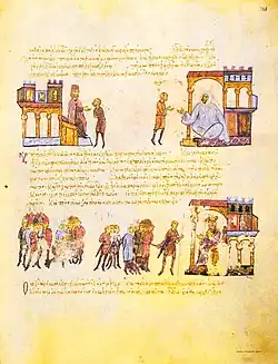 The anarchy in Constantinople had ceased after the murder of the pretender Constantine Doukas, however, and a government had promptly been formed with Patriarch Nicholas at the head.[64] This urged Simeon to raise his siege and enter peace negotiations, to the joy of the Byzantines.[64] The protracted negotiations resulted in the payment of the arrears of Byzantine tribute,[65] the promise that Constantine VII would marry one of Simeon's daughters,[16][63] and, most importantly, Simeon's official recognition as Emperor of the Bulgarians by Patriarch Nicholas in the Blachernae Palace.[66][67]