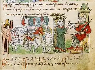 Byzantine Emperor Romanos I Lekapenos negotiating with Simeon I of Bulgaria c. 922–924. miniature of the Radziwill Chronicle (15th century).