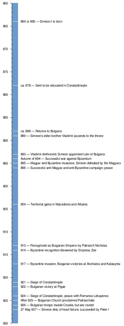 Simeon I the Great (Church Slavonic: цѣсар҄ь Сѷмеѡ́нъ А҃ Вели́къ; Bulgarian: цар Симеон I Велики, romanized: Simeon I Veliki[1] [simɛˈɔn ˈpɤrvi vɛˈliki]; Greek: Συμεών Αʹ ὁ Μέγας, romanized: Sumeṓn prôtos ho Mégas) was the ruler of the First Bulgarian Empire from 893 until his death in 927.[2] Simeon's successful campaigns against the Byzantines, Magyars and Serbs led Bulgaria to its greatest territorial expansion ever,[3] making it the most powerful state in contemporary Eastern and Southeast Europe.[4] His reign was also a period of unmatched cultural prosperity and enlightenment later deemed the Golden Age of Bulgarian culture.[5]